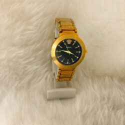 ساعت زنانه برند VERSACE ترکیبی بی نظیر از ظرافت،لوکس بودن و طراحی مدرن است. این ساعت با بدنه و بند طلایی رنگ، جلوه ای شیک و مجلل به استایل شما می بخشد. صفحه مشکی آن با جزییات ظریف و نشانگرهای براق، تضاد زیبایی ایجاد کرده و توجه هر بیننده ای را جلب میکند.