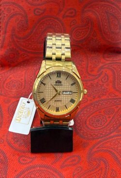 ساعت مردانه برند ORIENT ترکیبی از اصالت ژاپنی، طراحی کلاسیک و دوام بالاست. بدنه و بند طلایی رنگ آن، جلوه ای شیک و مجلل به استایل شما میبخشد. صفحه ی ساعت با طراحی خاص و اعداد رومی، جلوه ای کلاسیک و رسمی دارد که برای محیط های کاری و مهمانی ها انتخابی ایده آل است.